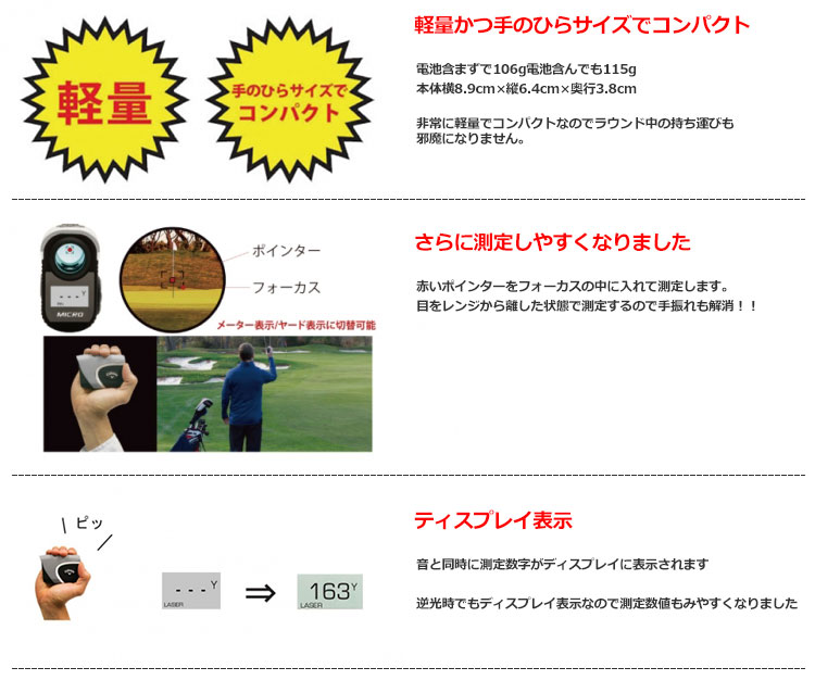 Micro Laser Rangefinderは軽量でコンパクトなのでラウンド中の持ち運びも邪魔になりません。