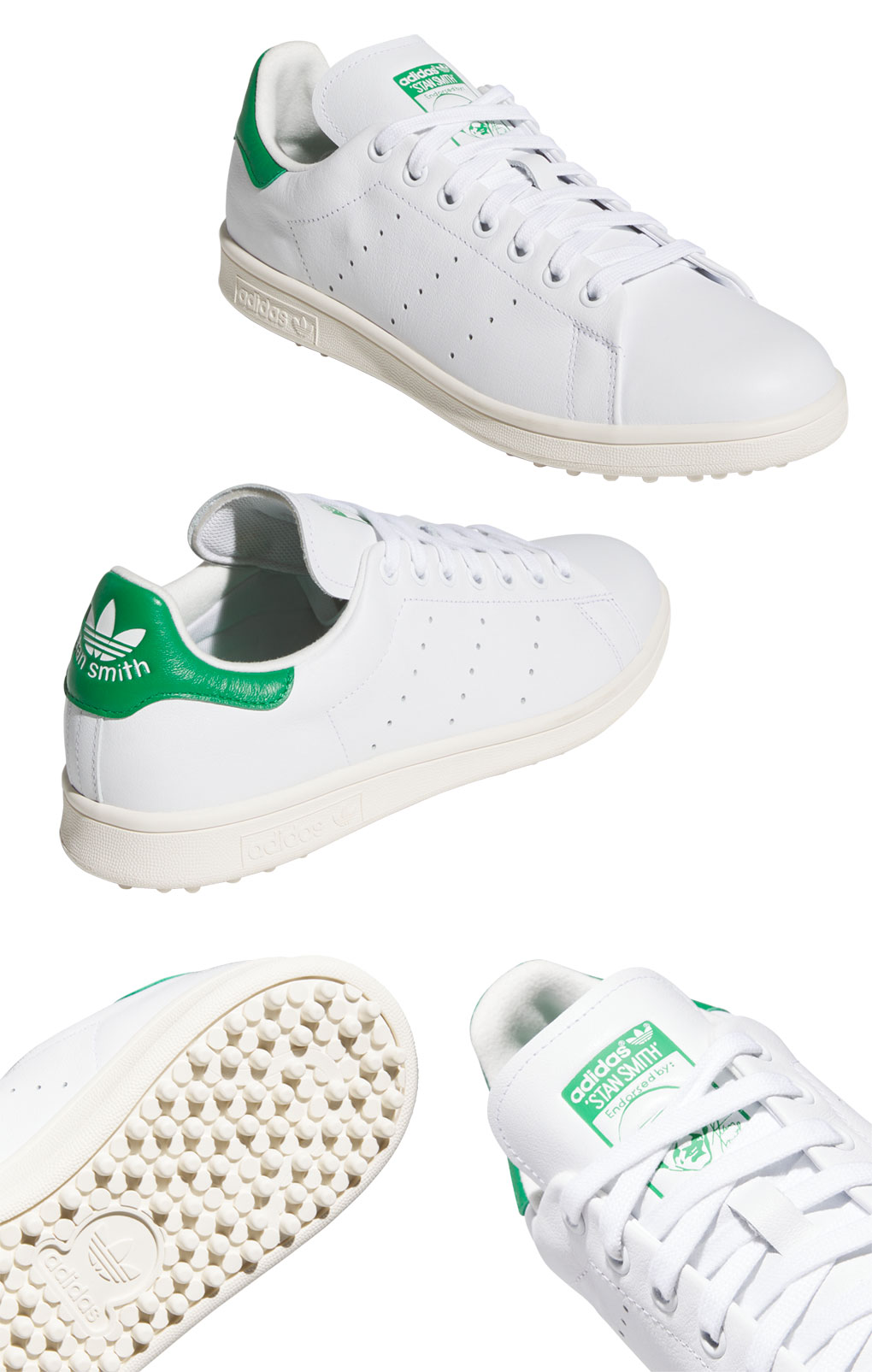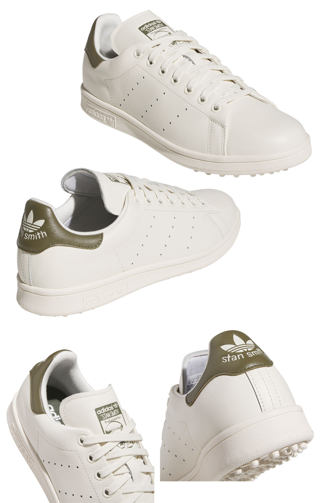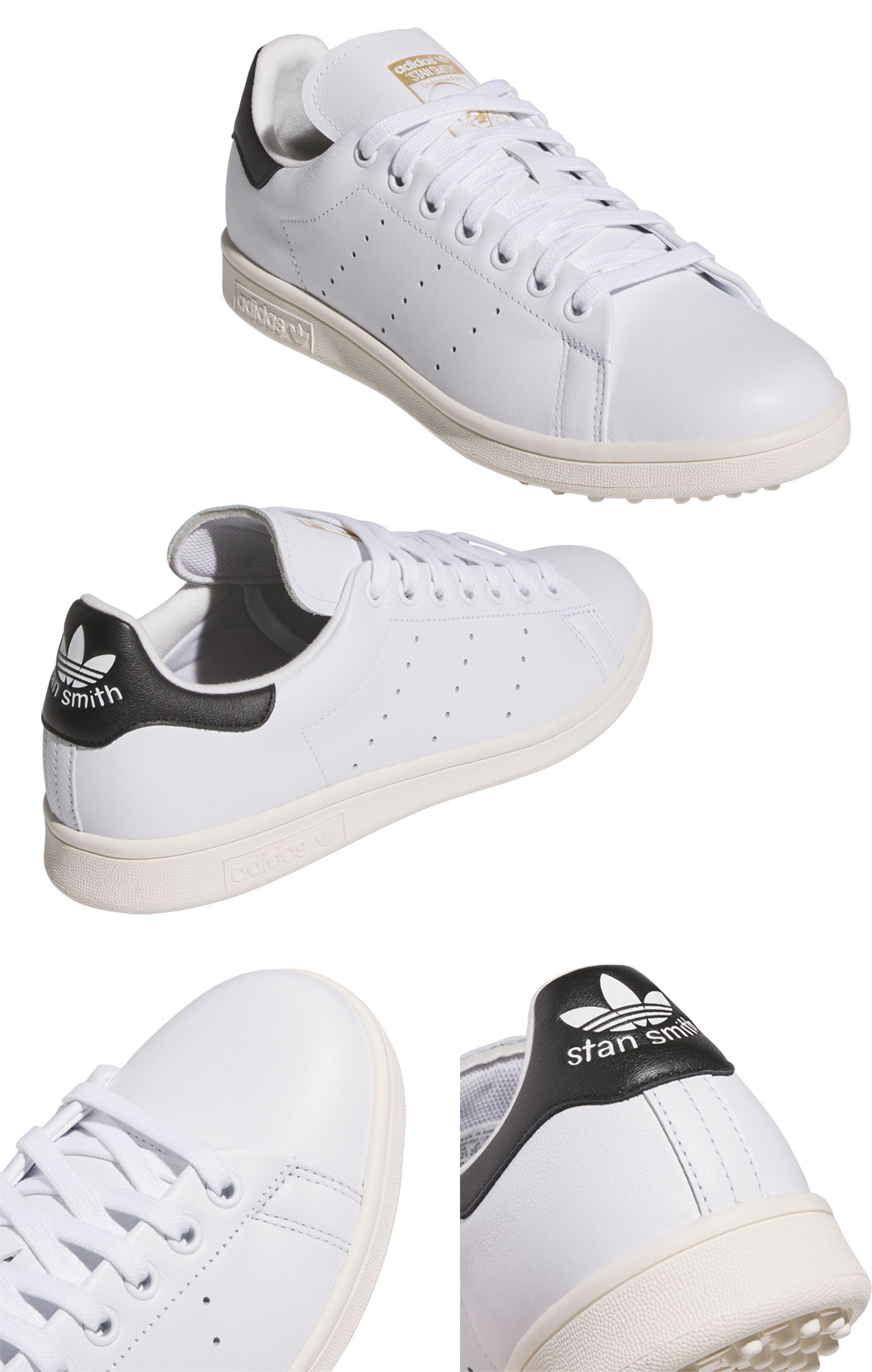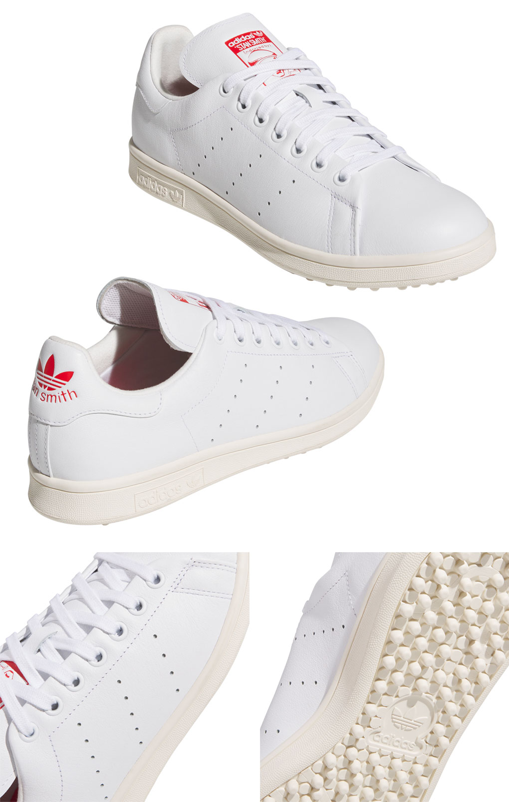 アディダスのアイコニックなスタンスミスをベースに、ゴルフの性能を融合したスタンスミスゴルフシューズ 。新たに上質でソフトな素材感に加え、防水性と耐久性のある天然皮革素材をアッパーに採用。スタンスミスゴルフのために専用開発のリサイクルラバースパイクレスアウトソールは、スイング時のグリップ力と汎用性を両立した高い性能になっている。また、シューズ内部にも歩行性能をさらに向上させるために、通常のスタンスミスには無い、追加のクッショニング素材がヒールに搭載されていることで、ゴルフシューズ特有の性能を持つ。タンデザインのゴルフハンチング帽をかぶったスタンスミスでコースにユニークな風を吹かすシューズ。