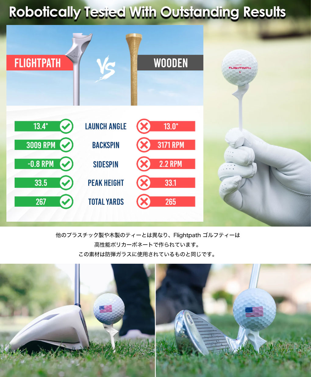 コースで友達に勝つ時も、次の全米オープンでプレーする時も、FlightPathゴルフティーがあれば、フェアウェイにロケットのような弾道のショットを打つ自信が得られます。
