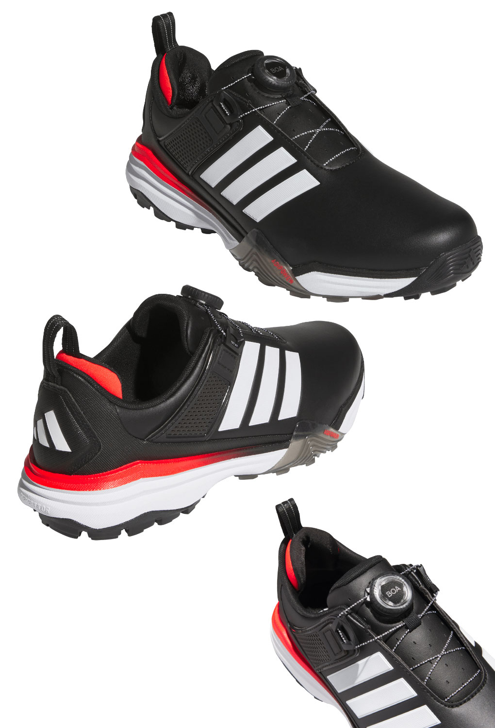 スイング時には足元から力強さを発揮し、その以外の時は快適性をもたらすトータルパフォーマンスの高いモデル、ADIPOWER。アッパーはソフトでありながらパワフルなスイングに対応し、防水マイクロファイバーレザーを採用。通気性の高いシュータンや BOA のフローティングパワーバンド、そして枕のような分厚いキャットタン・ヒールによって、特に足首周りの安定性を一般的なシューズより格段に向上させながら非常にソフトな履き心地を両立。