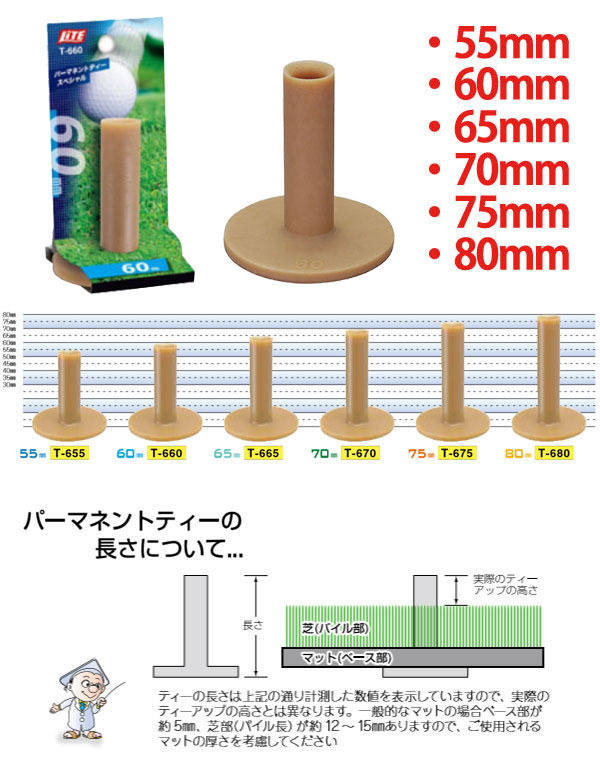 上記説明にもあります通り、実際のティーアップの高さは商品の表示の高さ(長さ)よりも低くなるため、ご利用になるマットの厚さを考慮していただく必要がございます。