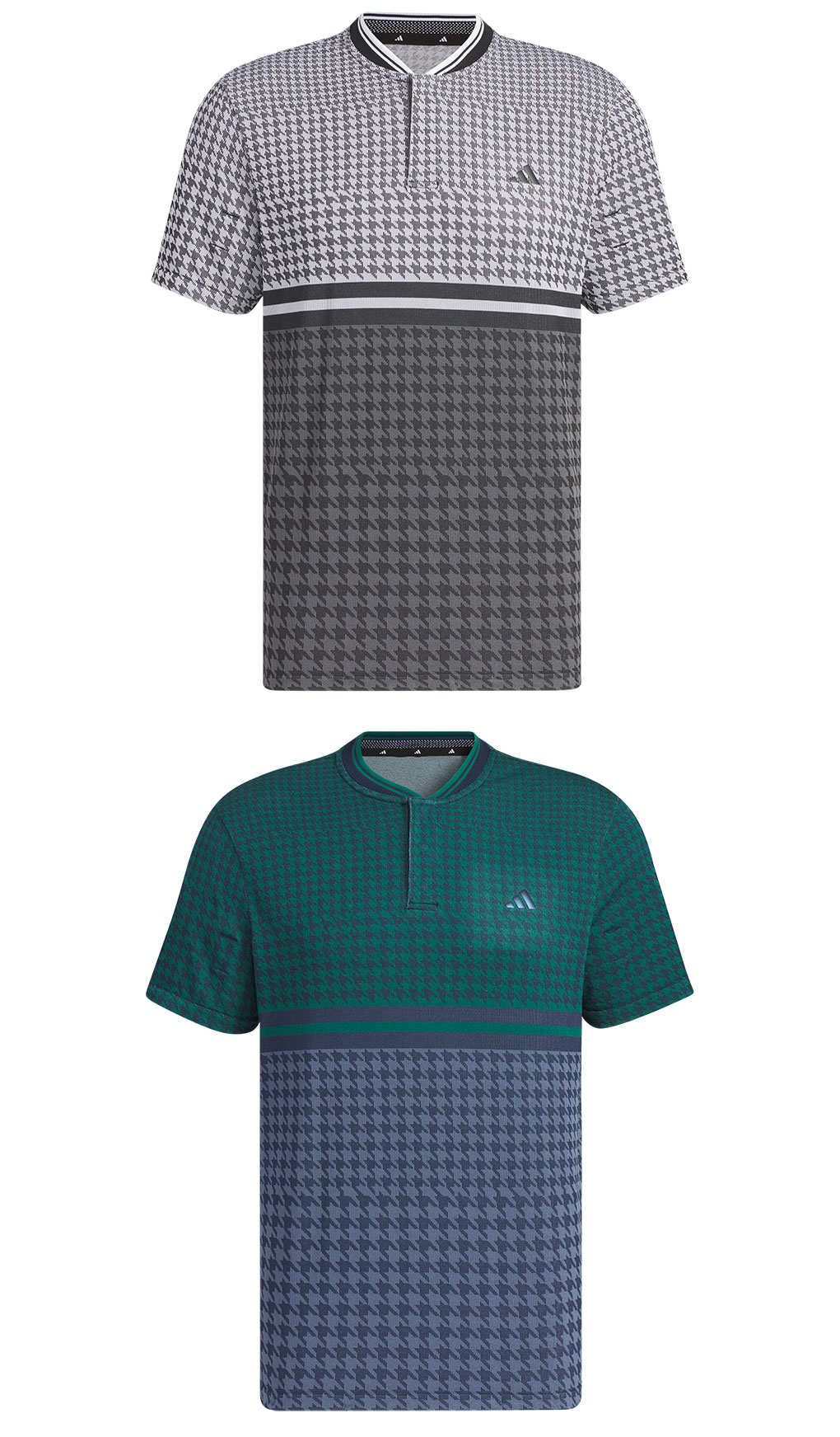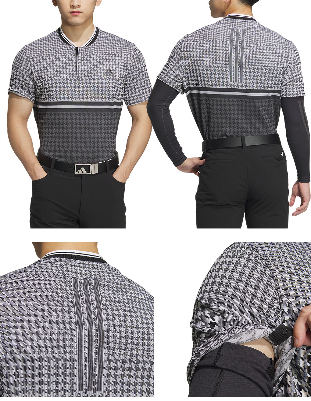 千鳥格子柄のPRIMEKNIT半袖シャツ。着脱可能なアームスリーブが付属されており、パフォーマンス低下の要因の一つである温度変化に対応したアイテム。後中心の配色スリーストライプスがポイントです。