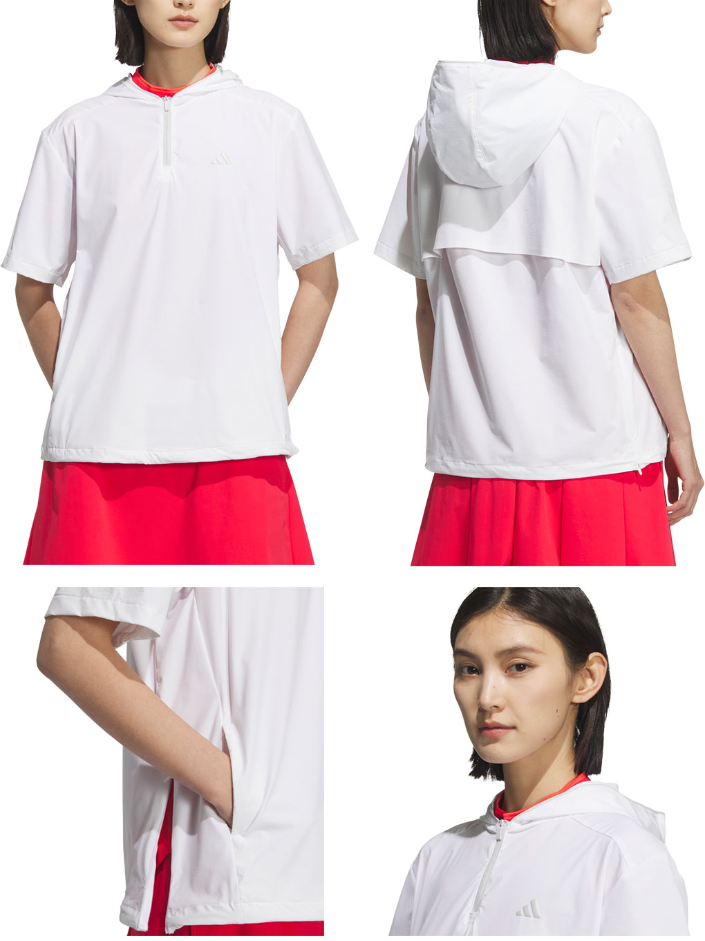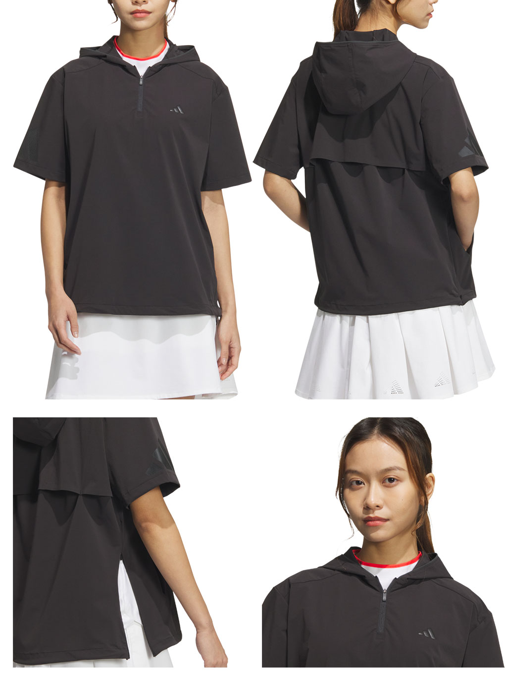 ストレッチ性の高い素材を使用したハーフジップ半袖フーディー。撥水機能も付いており、急な小雨にも対応したアイテムです。裾ドローコード仕様。