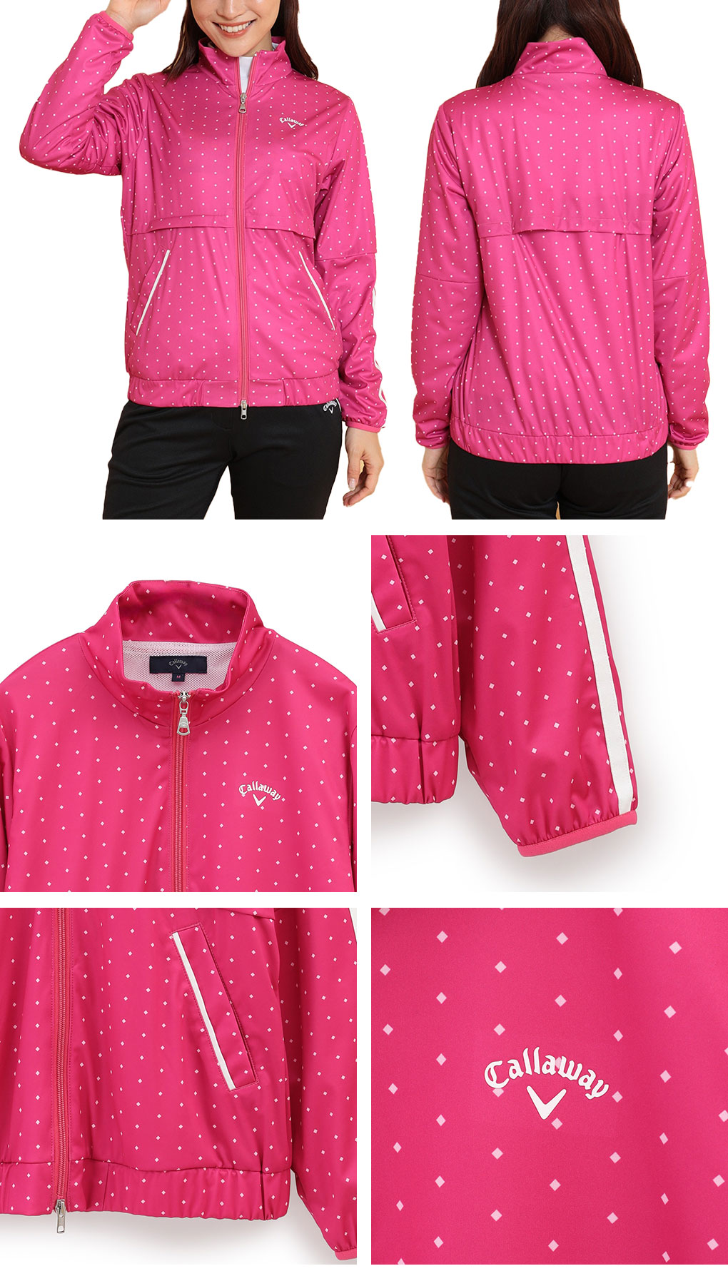 キャロウェイのイチ押し素材 「スターストレッチeco」 のアウター。着用期間の長いキャロウェイの定番的アイテムです。スクエアドットを全体にプリントしており、ポケット口と袖に施した配色テープがアクセント。メッシュの裏地をつけており、素肌に着用してもべたつかない仕様です。