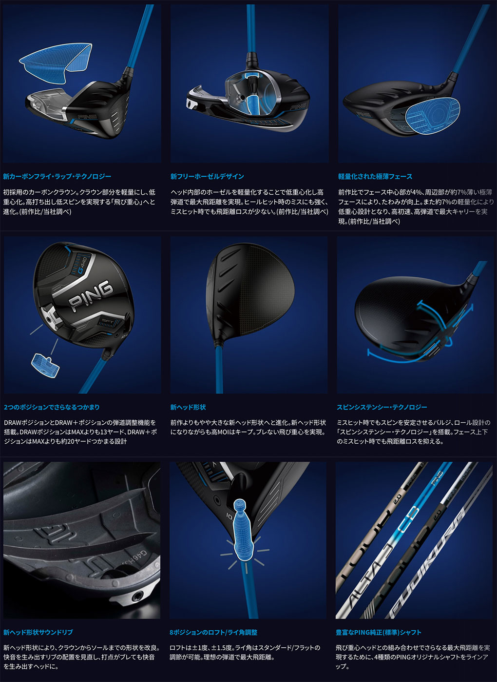 「新カーボンフライ・ラップ・テクノロジー」により、クラウン部分の余剰重量をヘッド下部に再配置、新設計の「フリーホーゼルデザイン」により、PING史上最も低い重心を達成し、高打ち出し低スピンを実現。