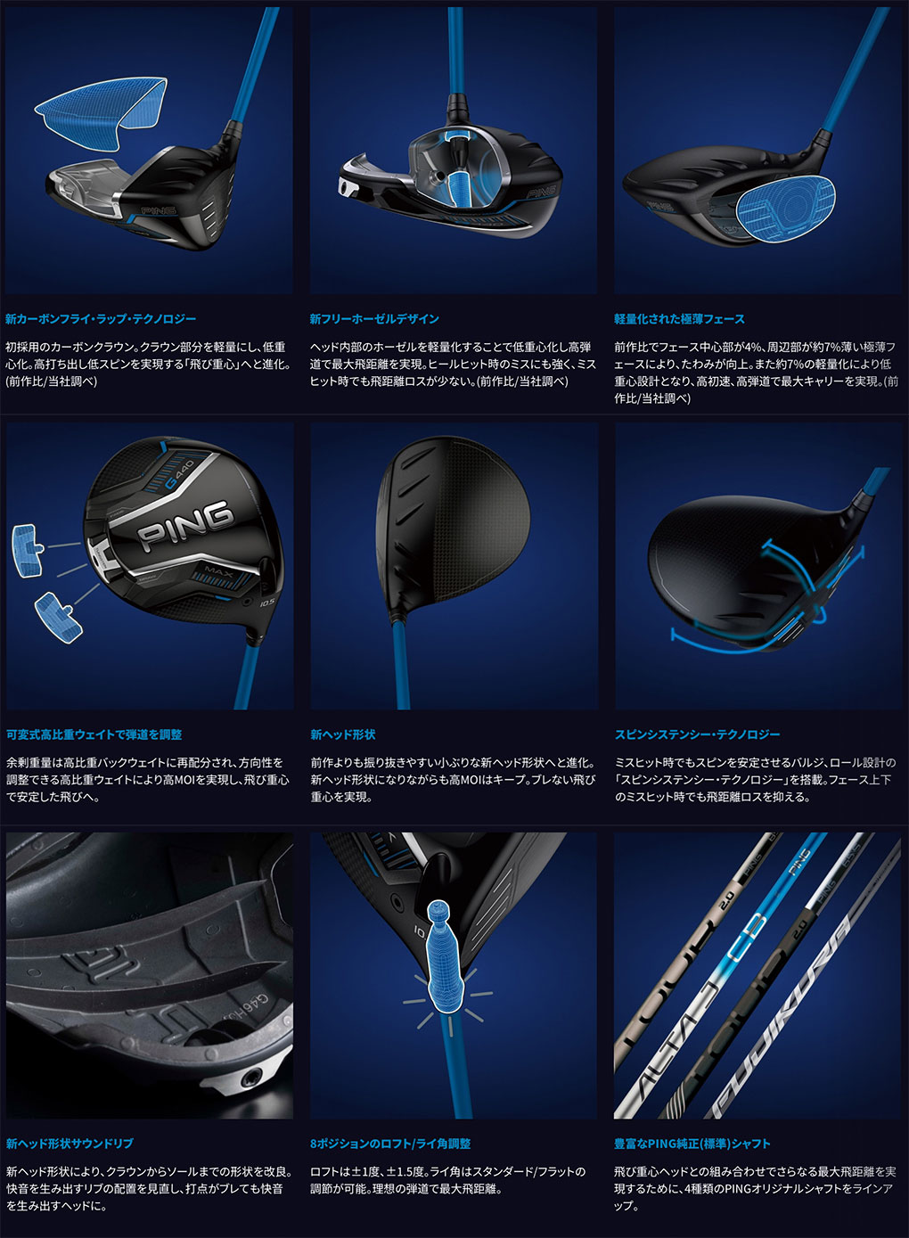 PINGが理想とする重心ラインに近づいた「飛び重心」設計でさらなる強弾道へと進化したG440LSTドライバー。「新カーボンフライ・ラップ・テクノロジー」により、クラウンの余剰重量をヘッド下部に再配置し、新設計の「フリーホーゼルデザイン」により、PING史上最も低い重心を達成し、高打ち出し低スピンを実現。フェースは前作よりも中心部で約4%、周辺部で約7%薄く設計され、飛距離性能が向上。