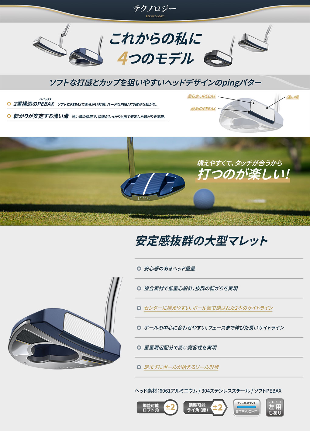 ソフトな打感とカップを狙いやすいヘッドデザインのpingパター