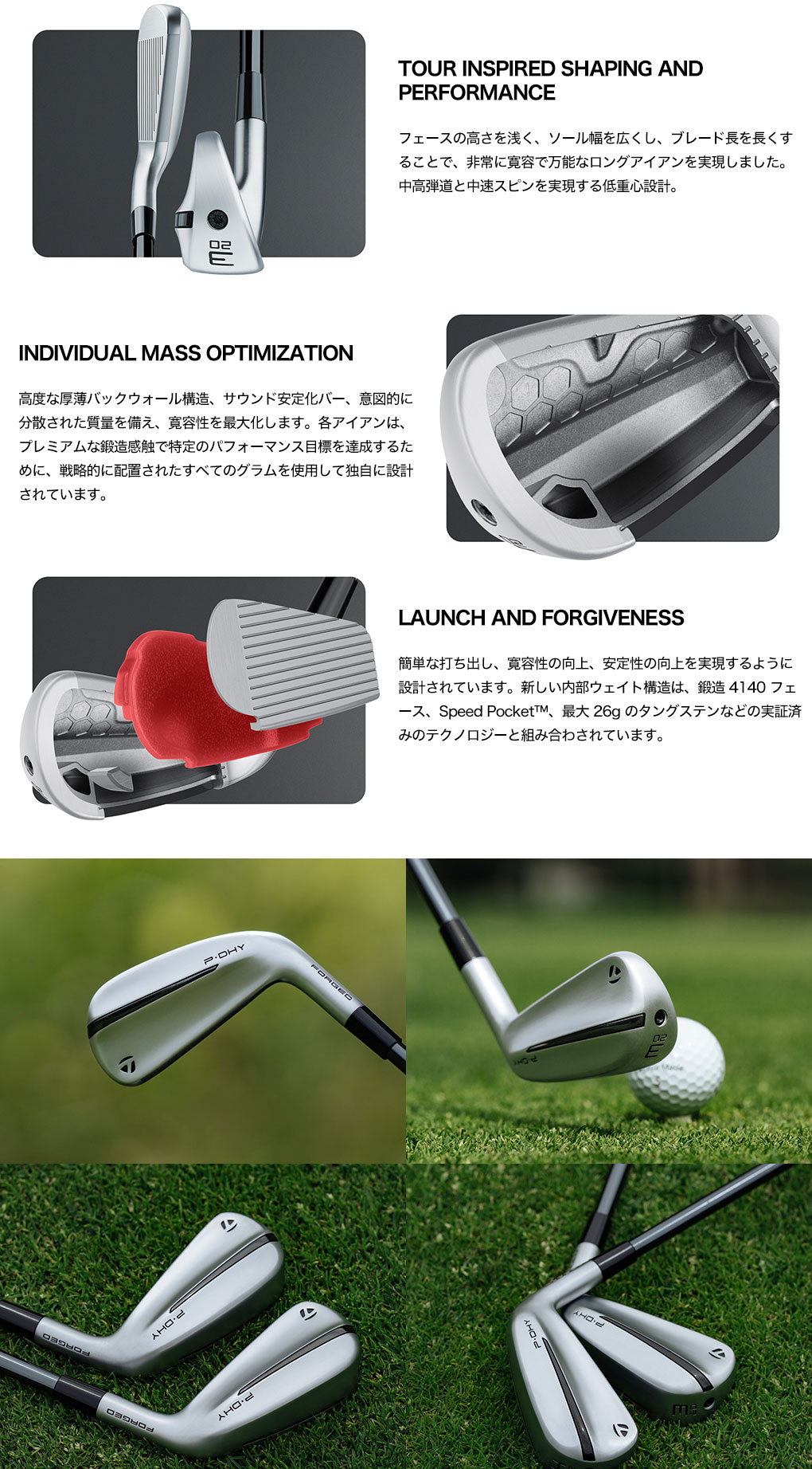 高度な厚薄バックウォール構造、サウンド安定化バー、意図的に分散された質量を備え、寛容性を最大化します。各アイアンは、プレミアムな鍛造感触で特定のパフォーマンス目標を達成するために、戦略的に配置されたすべてのグラムを使用して独自に設計されています。
