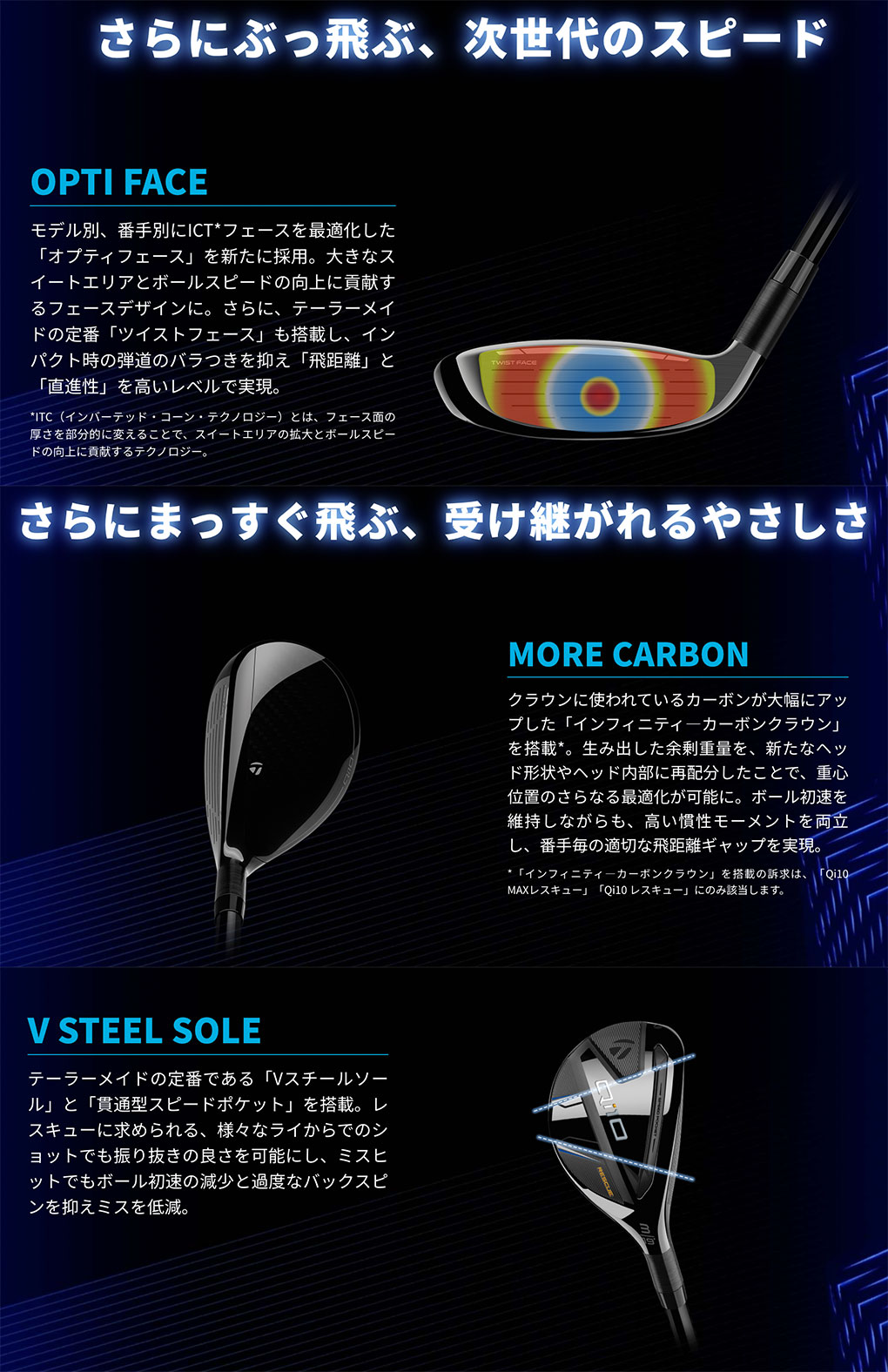クラウン部分にカーボンを多く使用することでヘッドの軽量化を実現。余剰重量をモデル毎に最適な重心位置になるように配分することで、寛容性を向上。高弾道でボールが上がる安心感と安定感がある「Qi10」レスキュー。