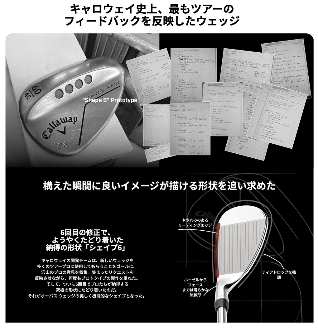 「OPUSウェッジ」の開発にあたり、力が入れられたのがシェイプです。約19カ月前にプロトタイプの製作が着手され、数多くのフィードバックをツアープレーヤーから受けながら、何度も改良。最終的に、6番目に試作されたシェイプ6と呼ばれる形状が採用されることとなりました。大きな特徴の1つがリーディングエッジで、ツアープロのフィードバックを反映し、JAWS RAWウェッジとJAWS FORGEDウェッジの中間的な丸みがあるものになっています。全体的には、トップブレードのヒール側が低すぎず高すぎないティアドロップ型で、ホーゼルからフェース面、とくにトップブレードに繋がる部分の造形は、従来の窪みがあるように見えるものではなく、非常に滑らかな曲面になっています。