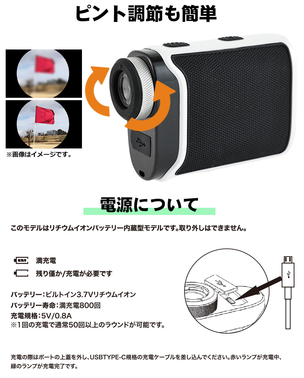 ・電池買い替えの必要がないUSB充電方式の内臓リチウムイオンバッテリー搭載、約50ラウンド(※)のプレーができるのでほぼ充電の必要なし