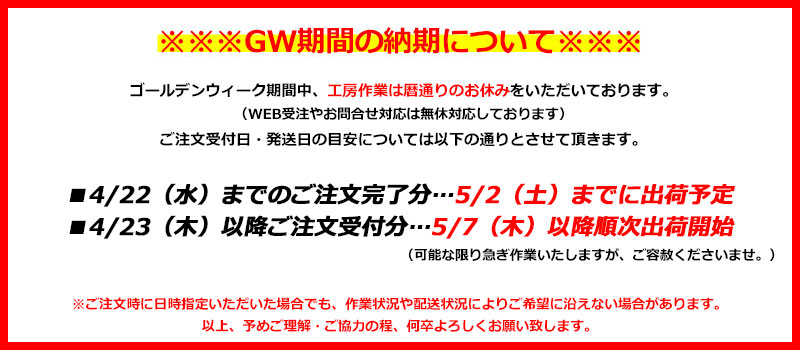 ※特に連休明け等は余分に日数を頂戴する場合があるため、余裕を持ってご注文ください。