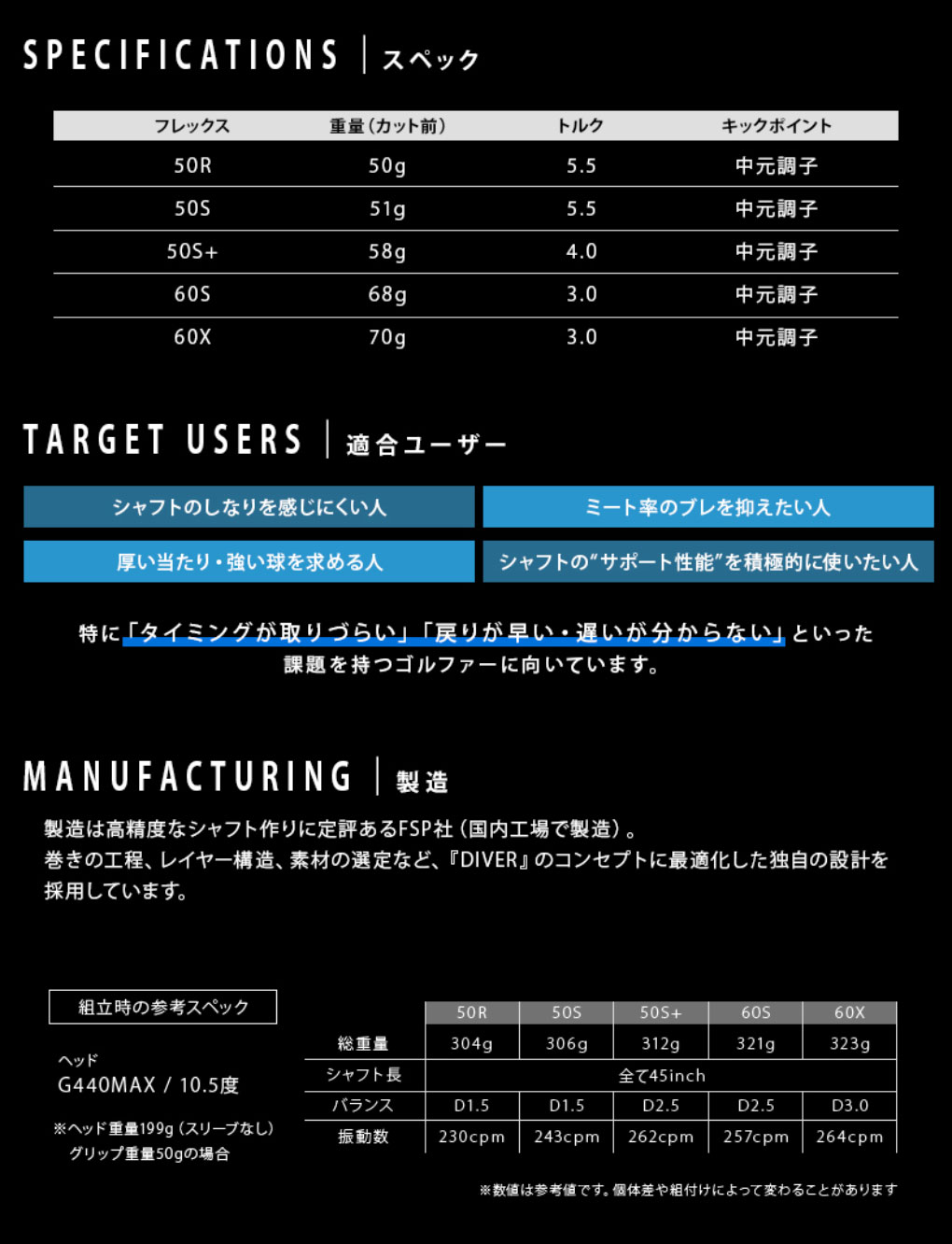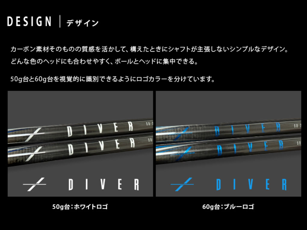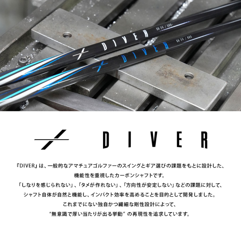 『DIVER』は、一般的なアマチュアゴルファーのスイングとギア選びの課題をもとに機能性を重したカーボンシャフトです。