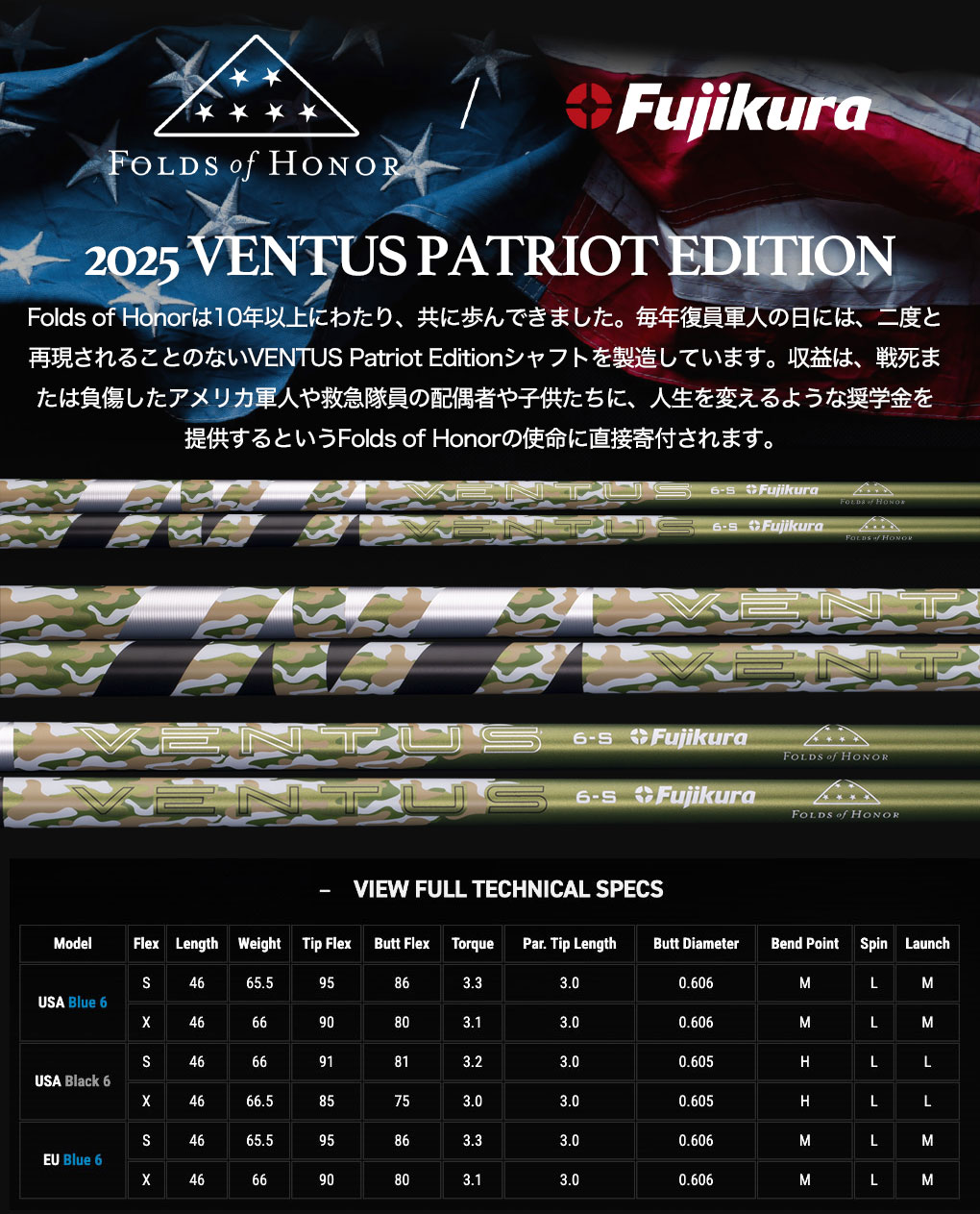 ■アメリカ軍の任務中に負傷、または亡くなった軍人家族を支援することを目的とした非営利団体「Folds of Honor(フォールズ・オブ・オナー)」の活動を支援するFujikura社は、退役軍人の日である11月11日に限定モデルシャフト「2025 VENTUS PATRIOT EDITION」を発売しています。