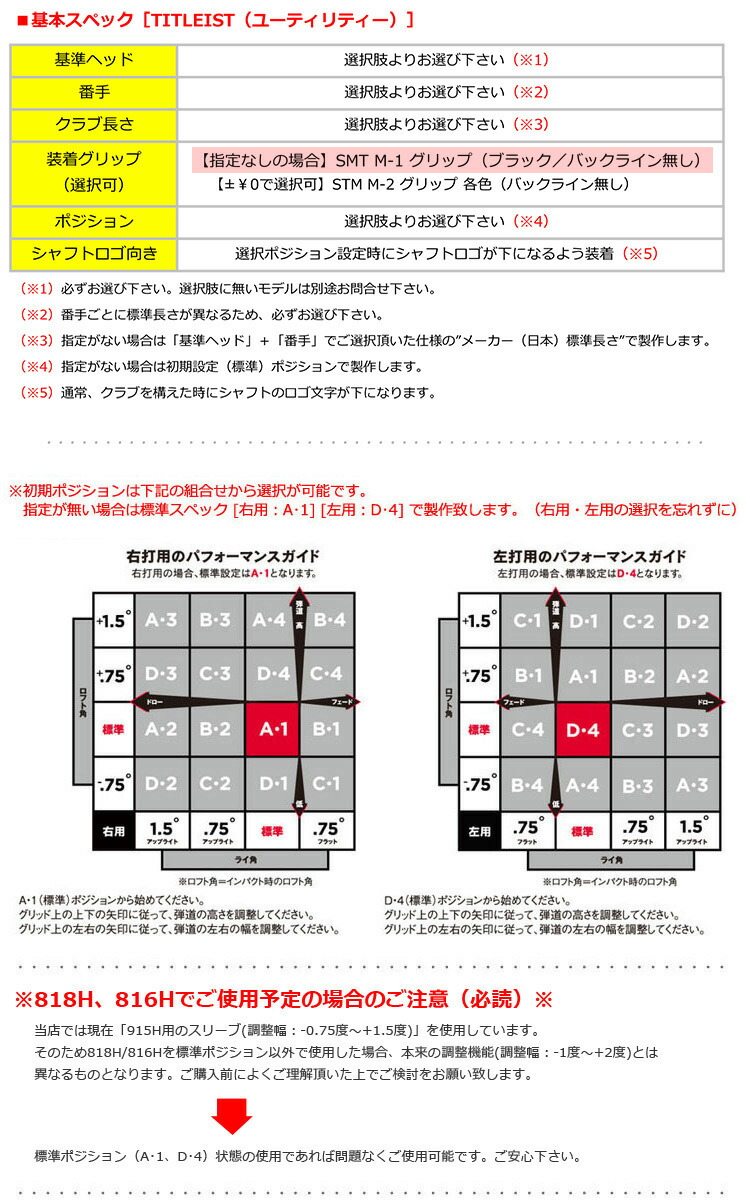 →当店では現在「915H用のスリーブ(ロフト幅:-0.75度~+1.5度)」を使用しています。そのため818H/816Hを標準ポジション以外で使用した場合、本来の調整機能(ロフト幅:-1度~+2度)とは異なるものとなります。ご購入前によくご理解頂いた上でご検討をお願い致します。