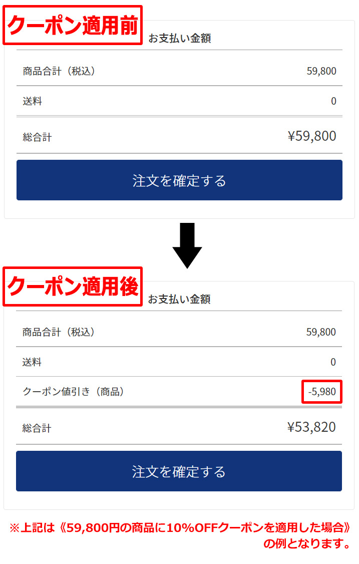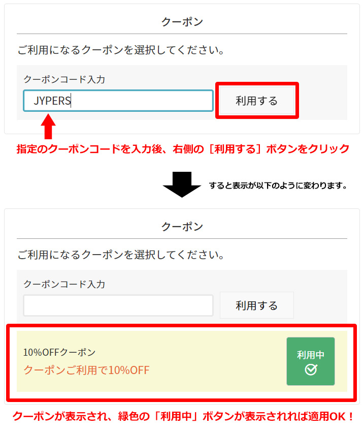 クーポンコードのご利用方法 01 対象商品をカートに入れ、ご注文手続きページへお進みください。 「クーポンコードを入力することで対象商品に各種クーポンが適用される」キャンペーンを一環で不定期で行っております。 開催時は、分かりやすい場所にクーポンコードを公開します。 ご希望商品が見つかったら、通常のお買い物と同様に先のページへお進みいただき、下記の通りクーポンの適用をお試し下さい。 02 ご注文手続き画面内の『クーポン』の項目をチェック 1.クーポンコード入力欄に、予め取得したクーポンコードを入力し、「利用する」をクリック。 2.正しく入力できていれば画面が切り替わり、適用されるクーポンが表示されます。 3.このとき「利用する」ボタンが緑色に切り替わっていればクーポン適用OKです。 ※他クーポンとは重複利用できません。ご了承下さい。 ※ご注文内容の表示以外は通常のご購入方法と同様です。 ※ご購入までの流れについてはこちら。 クーポンが適用されると、「お支払い金額」の欄に適用されるクーポン値引き価格が表示され、合計金額も自動的に計算・修正されます。 ご確認後、問題なければ「注文を確定する」ボタンよりご注文下さい。 03 【注意事項】 ※クーポンコードはメールマガジンやクーポン開催時の説明ページ等に表示します。 ※ご注文番号1件=ご利用回数1回分です。 ※「期間前のご注文分をキャンセルして買い直す」「複数のご注文を後からまとめる」など、例外適用は一切不可と致します。