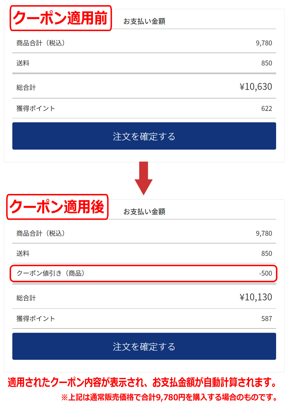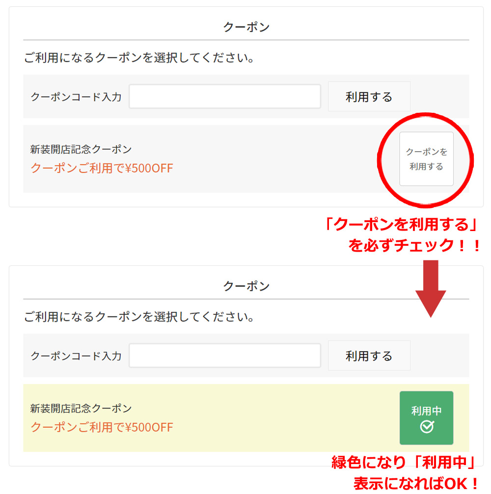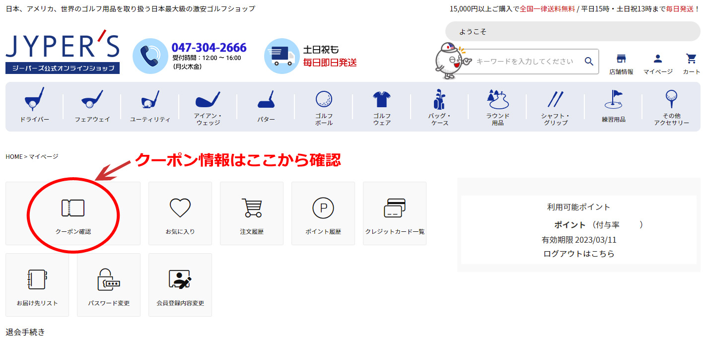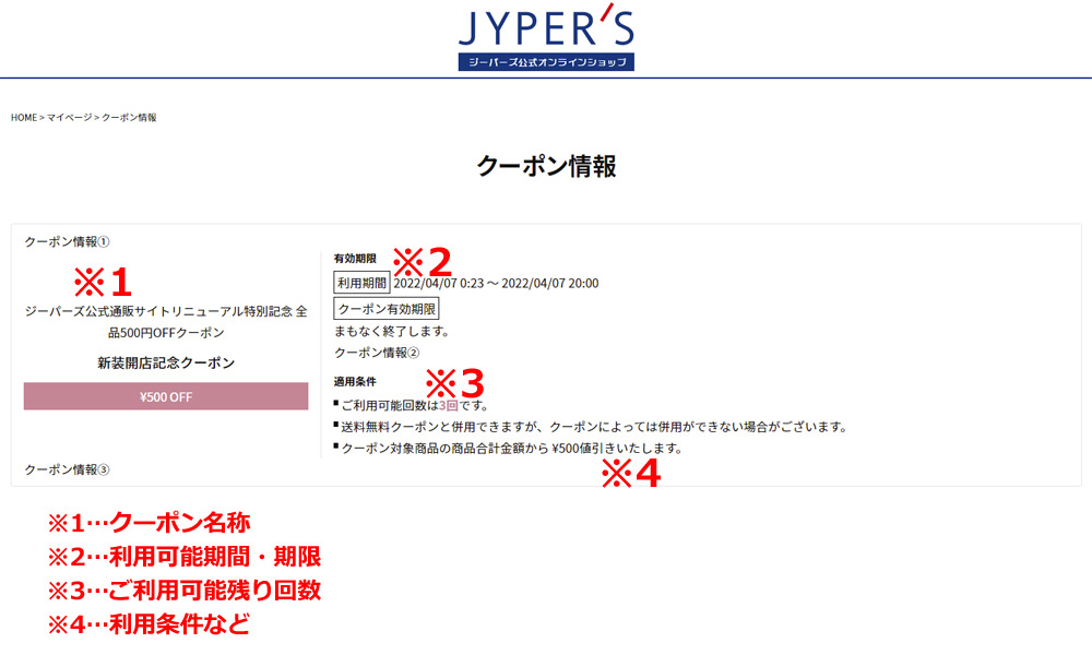 開催中のクーポン クーポンのご利用方法について 01 ご注文手続きページまでお進みください。 ご希望の商品が見つかりましたら、通常のお買い物と同様、会員ログインしてから先のページへお進みください。 ※クーポン適用には会員ログインが必須です。ご注意下さい。 02 ご注文手続き画面内のクーポン適用ボタンをチェック 利用可能なクーポンを所持した状態でご注文手続き画面へ進むと、「クーポン」の項目が表示されます。 ※「クーポンを利用する」ボタンはデフォルトでONになっています。 ※その時点で利用可能なクーポンのうち、最も古い、または割引率の高いクーポンが自動でONになっています。 ※ご利用希望のクーポンと異なる場合は選びなおしていただき、ボタンが緑色(ONの状態)になっていることをご確認の上お進みください。 ※その他の項目は通常通りの手順で設定ください。 ※ご購入までの流れについてはこちら。 クーポンが適用されると、「お支払い金額」の欄に適用されるクーポン値引き価格が表示され、合計金額も自動的に計算・修正されます。 ご確認後、問題なければ「注文を確定する」ボタンよりご注文下さい。 03 ご利用可能なクーポンの確認方法 ご利用可能なクーポン情報等は、会員ログイン後にマイページから確認が可能です。 ※画面右上の「マイページ」から「クーポン確認」へお進みください。(ログインされていない場合は表示されません。) 【クーポンご利用に関する注意事項】 ※WEB(Jypers.com内)でのご注文分に限ります。(実店舗等での適用は不可) ※ご注文番号1件=ご利用回数1回分です。 ※「期間前のご注文分をキャンセルして買い直す」「複数のご注文を後からまとめる」など、例外適用は一切不可と致します。