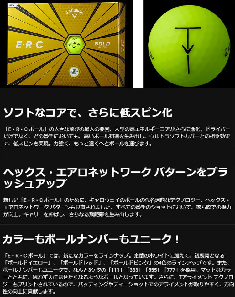 他の画像を見る ゴルフボール E・R・C 2019モデル 飛びの力、バージョンアップ 初展開のボールドカラーも楽しい! 【毎日発送】キャロウェイ E・R・C 2019モデル ボール 1ダース 日本正規品【ERC】ホワイト イエロー ピンク レッド 当店価格 ¥ 3,300 税込 カートに入れる お気に入りに登録する 在庫切れ